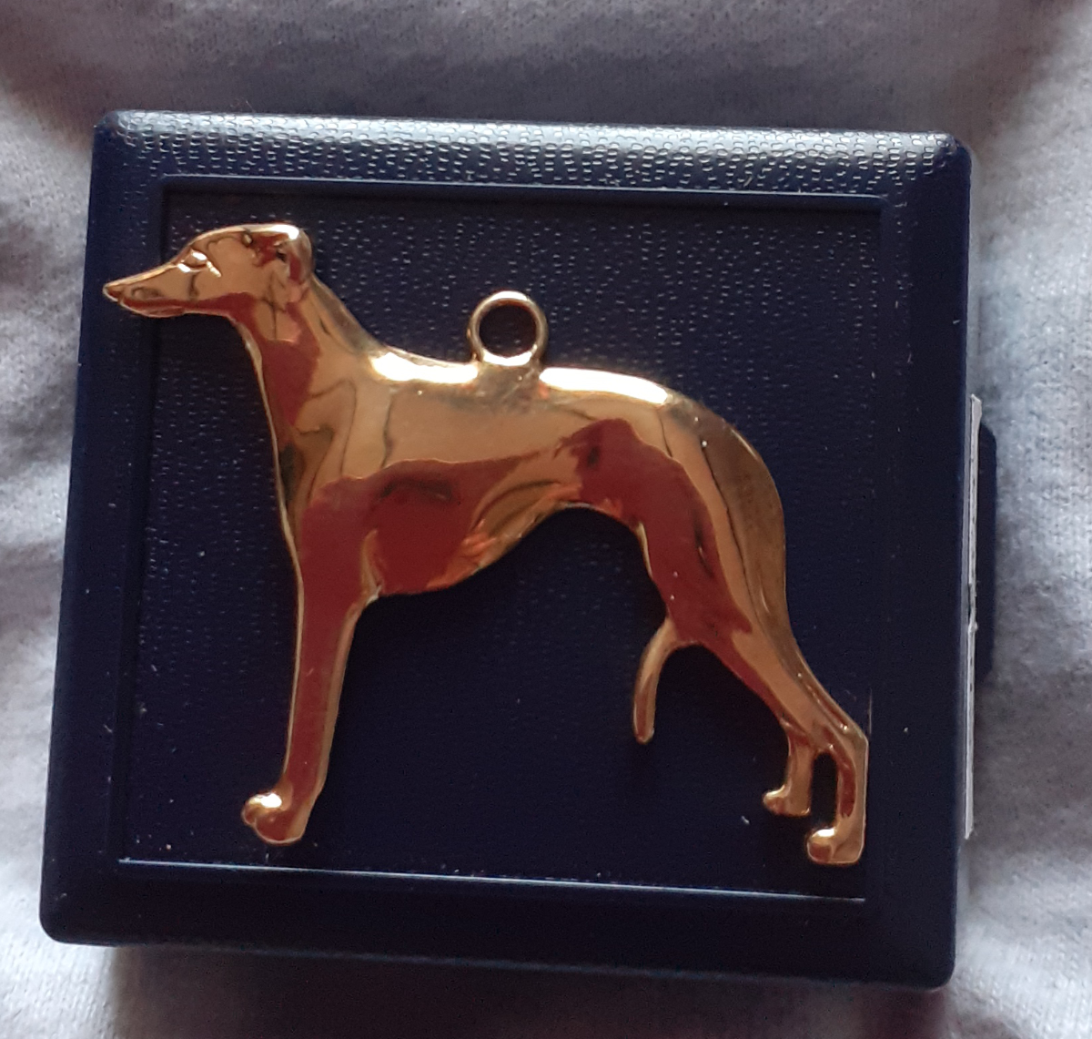 Brass charm of a standing hound by Gingerberry. Length approx 3.5cm, height approx 3cm