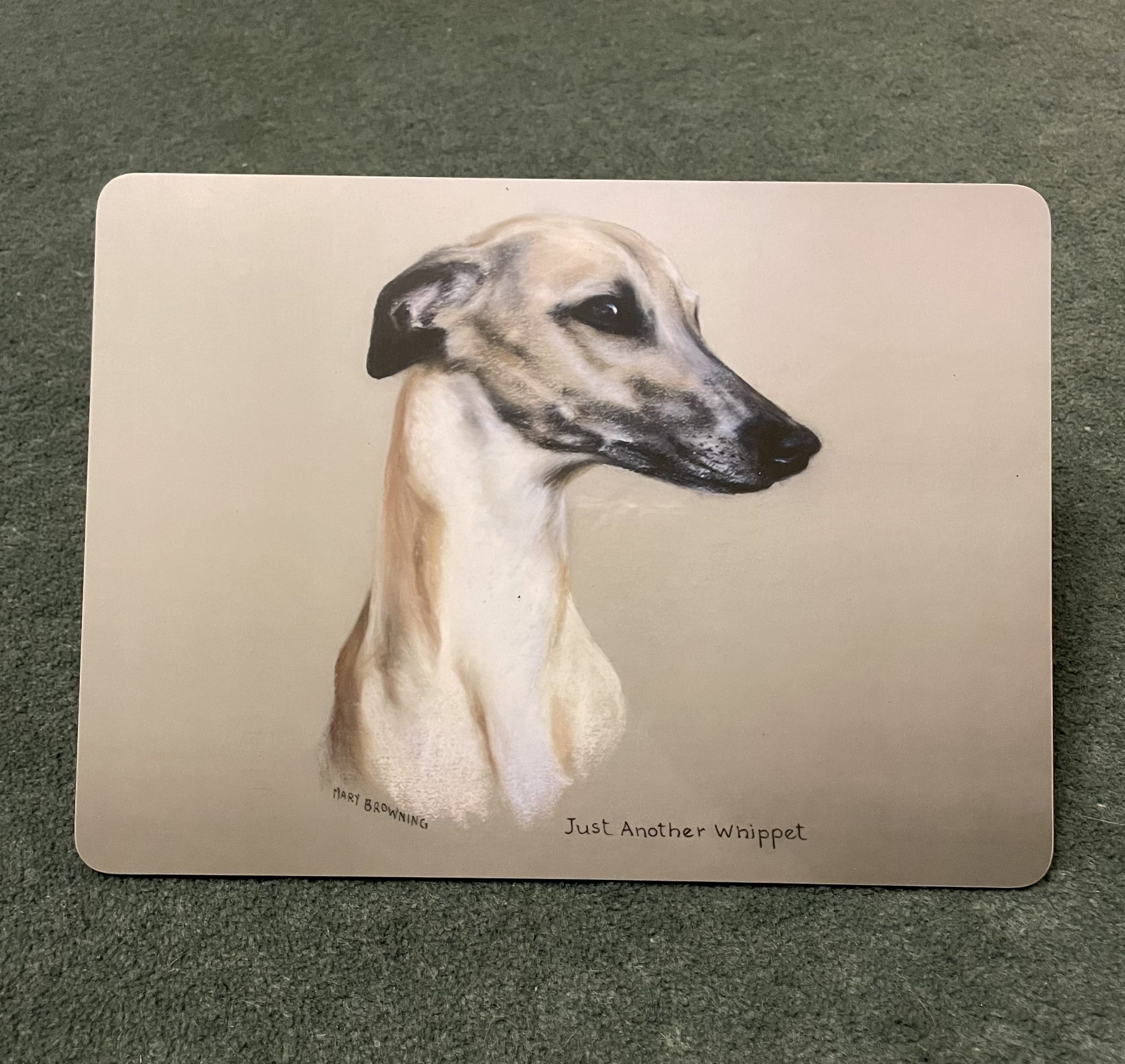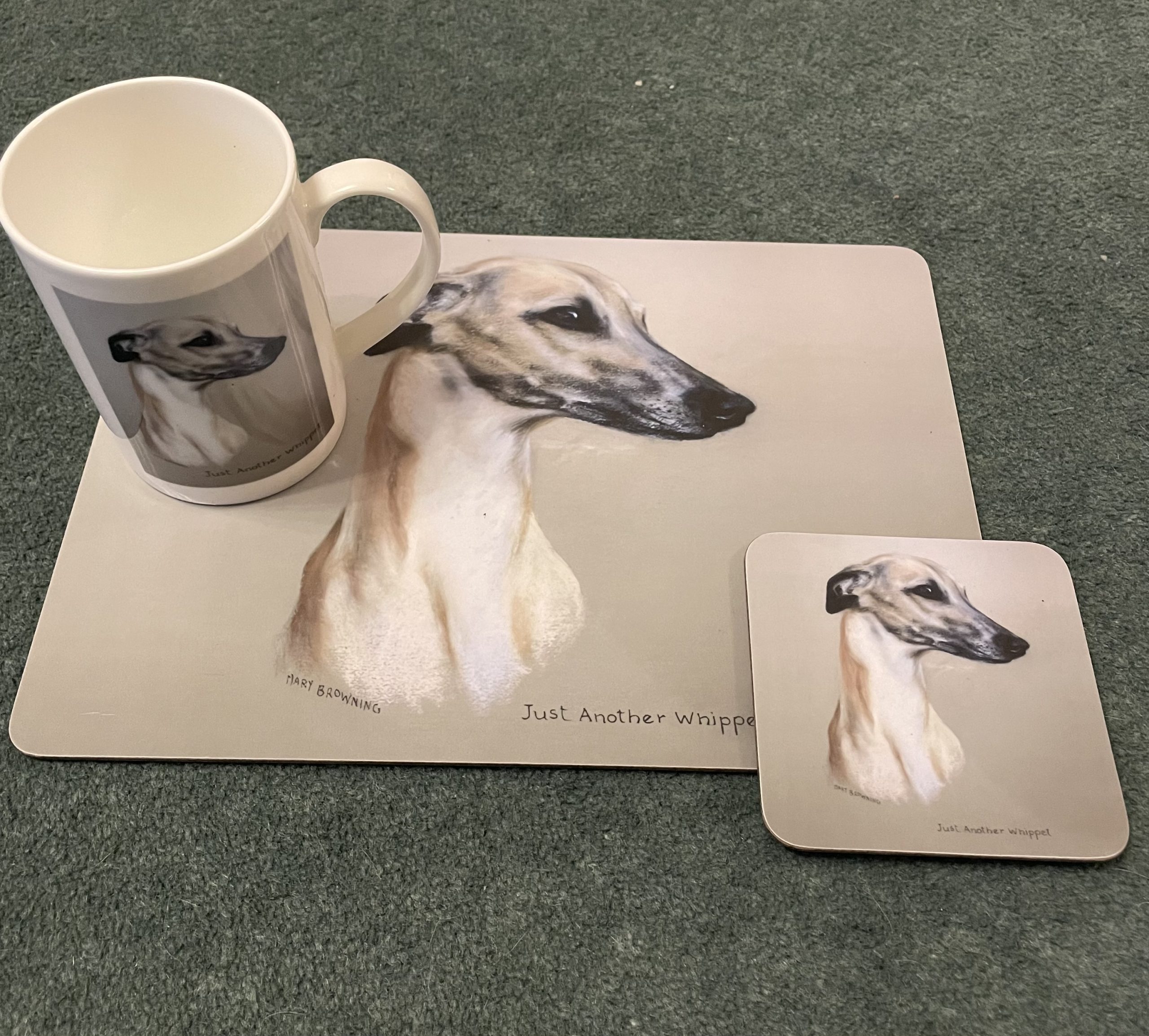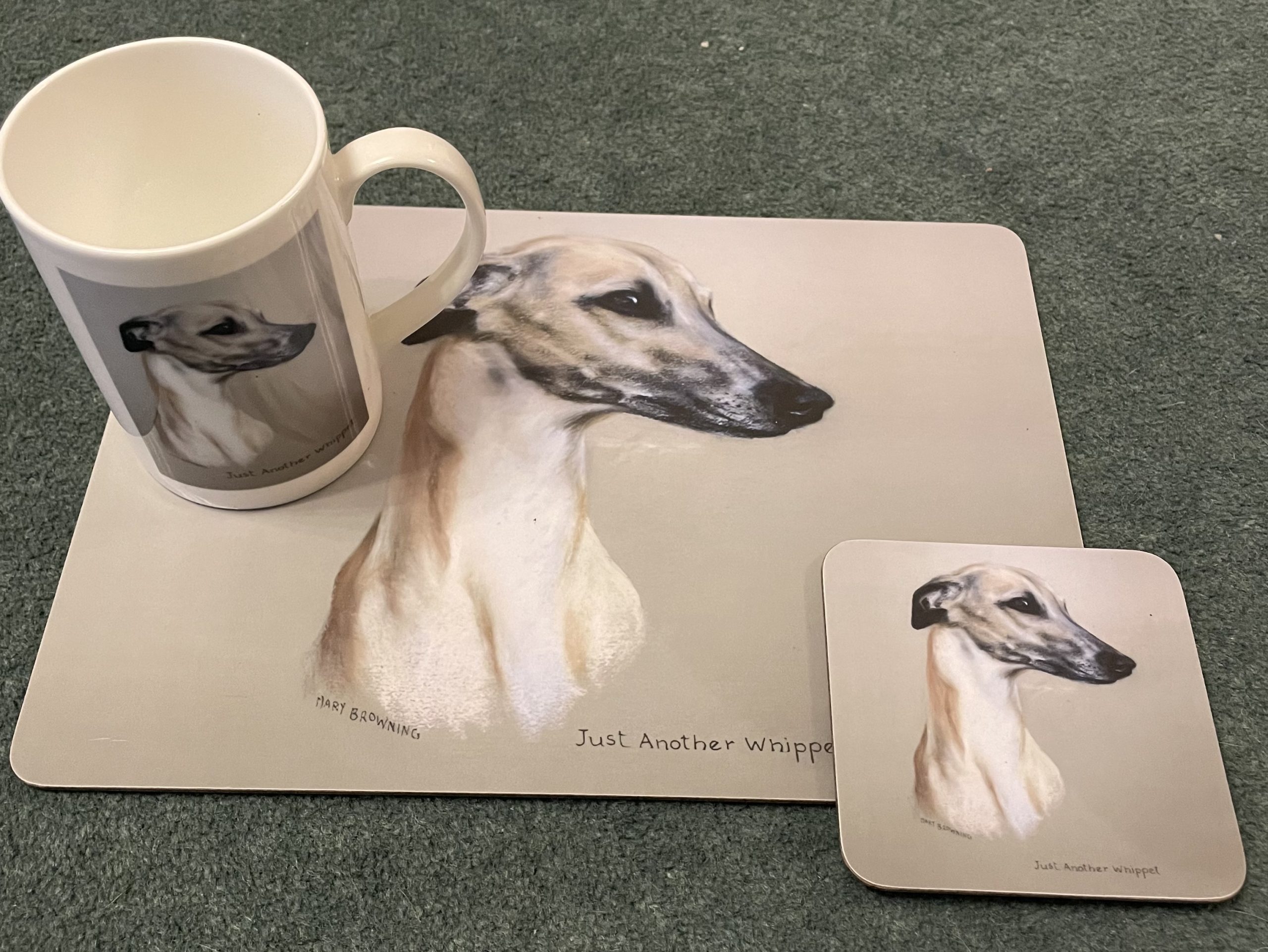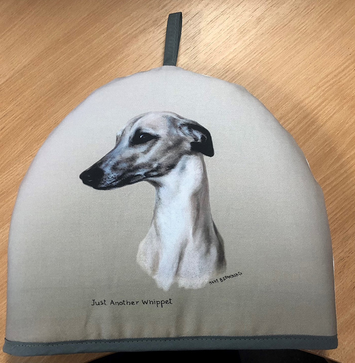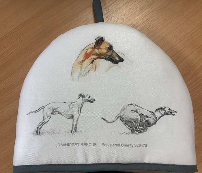 Various kitchenware items exclusive to JR Whippet Rescue by the late Mary Browning, ‘Just a Whippet’ print. Buy each one singularly, or treat yourself to a set!